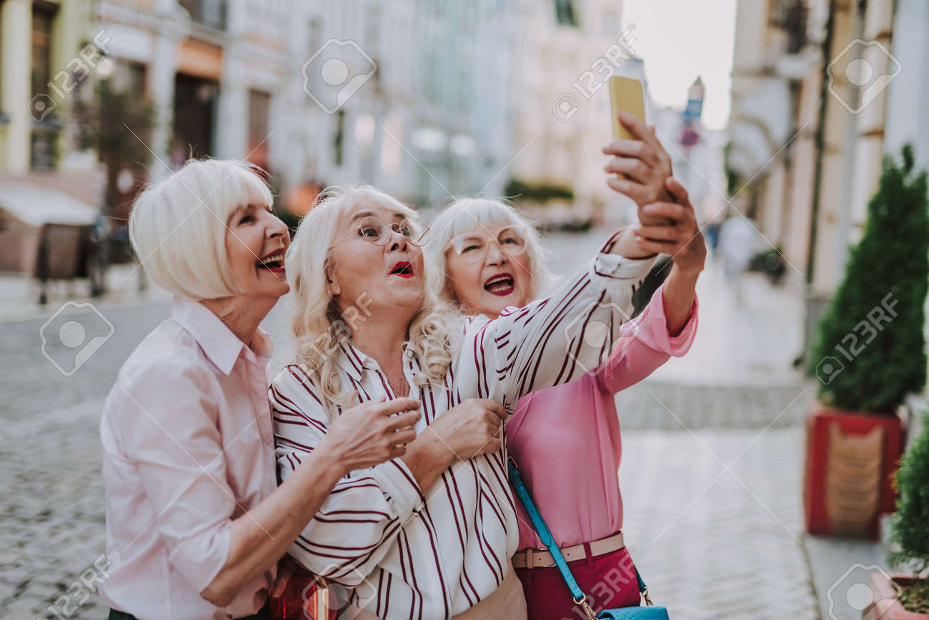 Three Funny Old Ladies Making Selfie Together Stock Photo Picture