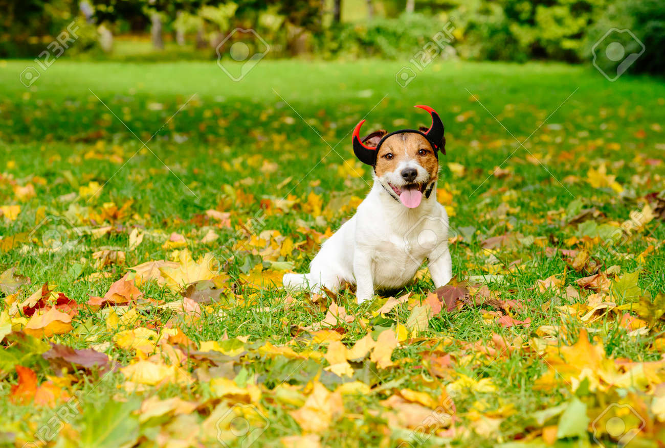 Dog In Halloween Costume Of Funny And Not Scary Devil Sitting